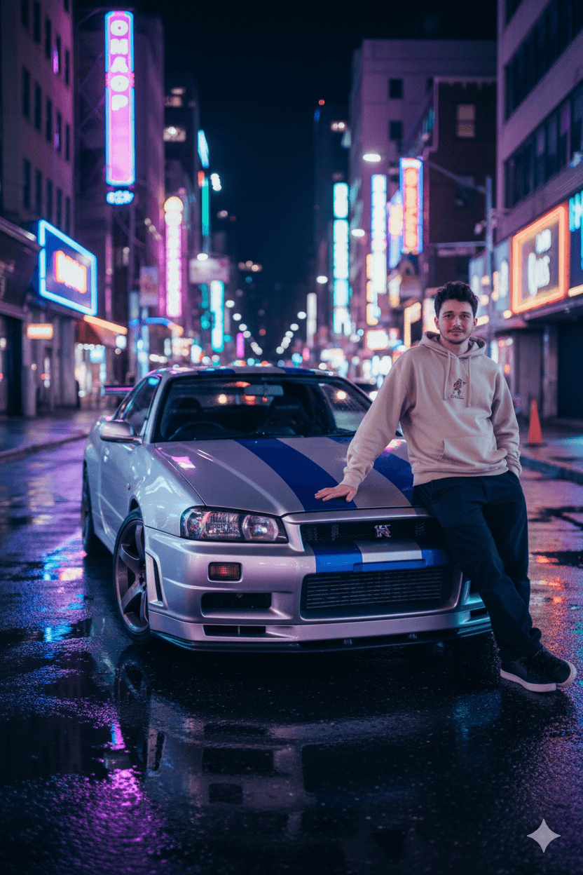 Create a hyper-realistic cinematic night scene. Use the uploaded portrait as the face reference. The face must match the reference exactly — no changes to facial structure, expression, or texture. No melting, no smoothing, no stylization. Maintain realistic skin details. The character is leaning casually against the hood of a Nissan Skyline GT-R R34 (silver with blue stripes, Fast & Furious / Paul Walker style). Body posture: relaxed, one hand resting on the hood, confident stance. Scene is set in a neon-lit city street at night (Tokyo / New York fusion). Neon signs reflecting on wet asphalt, purple-blue-pink light highlights on the car surface. Strong cinematic depth-of-field: the car and character in sharp focus, background slightly blurred with glowing neon bokeh. Lighting: - Soft rim light from neon signs - Subtle blue reflections on car paint - Slight warm fill light on face to match reference skin tone Atmosphere: Moody, stylish, late-night street vibe. Include subtle reflection of the car and character in the wet ground. No exaggerated lens distortion. No cartoon look. Overall look: Ultra-realistic, cinematic, neon color palette, film-grade clarity.