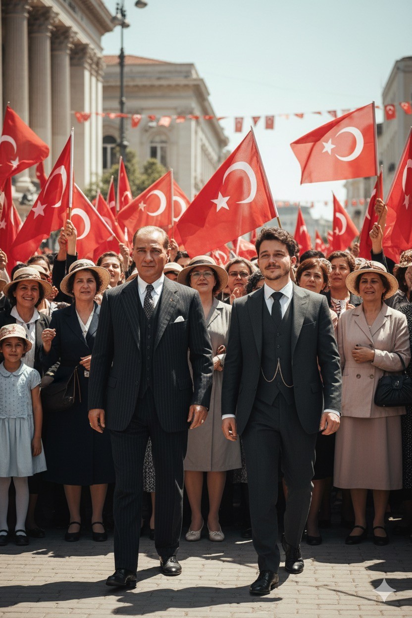 A realistic color photograph of Mustafa Kemal Atatürk walking proudly at the front of a Republic Day parade, side by side with the person exactly as seen in the uploaded photo (do not alter their face or appearance). Both are wearing formal suits and walking with confidence. In the background, a diverse crowd of women, men, and children stands proudly, many holding Turkish flags and smiling. The crowd should include a visible presence of women, symbolizing the equality and unity of the new Republic. The scene takes place on a bright, sunny day in Ankara, with red and white flags and subtle historic early-Republic architecture in the distance. The atmosphere feels patriotic, emotional, and full of hope. The image should be realistic, high-resolution, in color, with natural lighting and a modern cinematic look, as if captured by a professional photographer recreating the early Republic period.